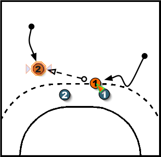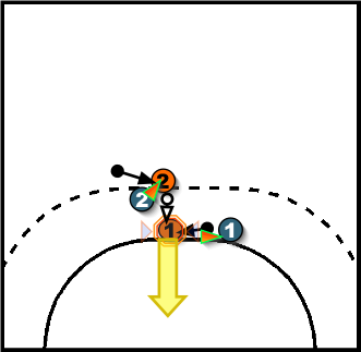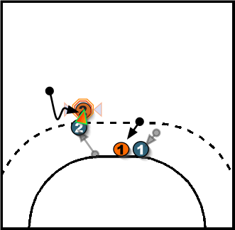 OF1はそのままポストへ入り、DF1をシール(ブロック)。OF2はシュートを狙ってDF2を引き出す。