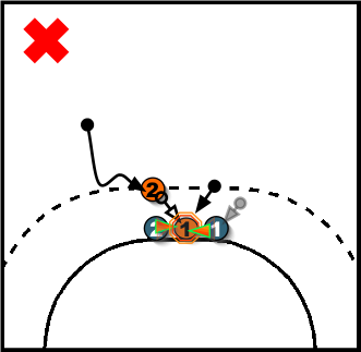OF2がフリーなのにシュートを打たない(または、「OF2がシュートを狙ってないので、DF2が出てこない」)。そしてOF1が空いていないのにパスを出してしまっている。