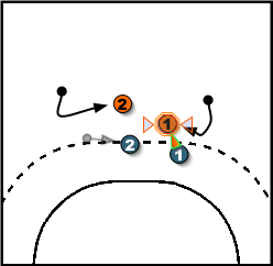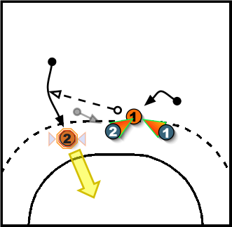 OF1はDF1が自分についてきているのを確認したら。DFから離れた方の手(図の場合、右手)でボールをふわりと後方に浮かす。OF2はそのボールをかっさらい、シュート。