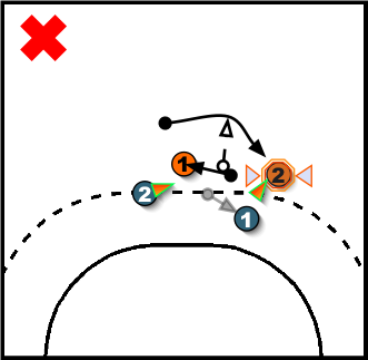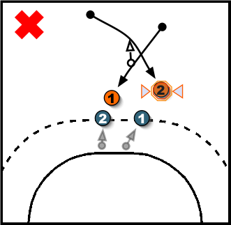 せっかくOF2がDF2を引きつけたのに,わざわざDFの正面にOF1が突っ込んでいる。