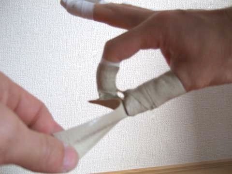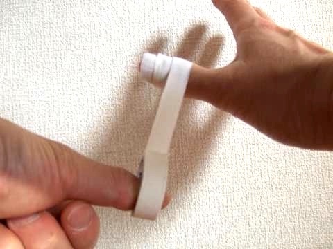 つめに指用テーピングテープをつける。巻く順序は,「利き腕じゃない手」→「利き手」の順。