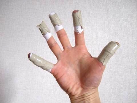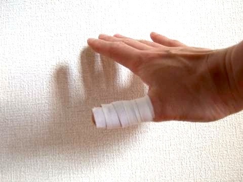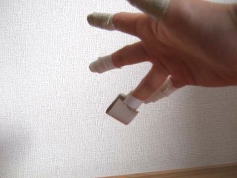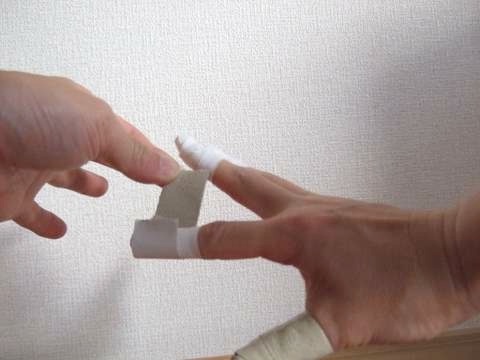 全部まくとこんな感じ。僕は第一関節のすぐ上まで巻いてます(指が曲がってよいので)。お好みでどうぞ。