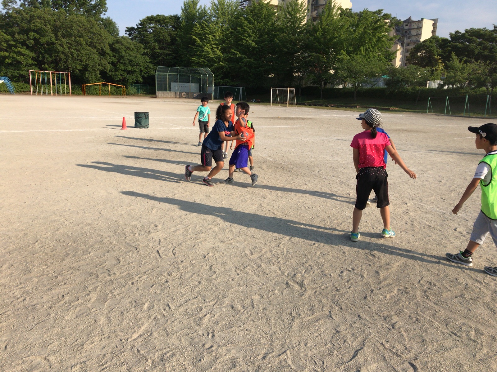 付き添いできてくらたお父さんにキーパーに入ってもらったところ、経験者だったことが判明。なかなかシュートが入らず、みんな本気モードです。お父さん、動きが鋭すぎてズボンを破いてしまいました。北斗の拳みたい。