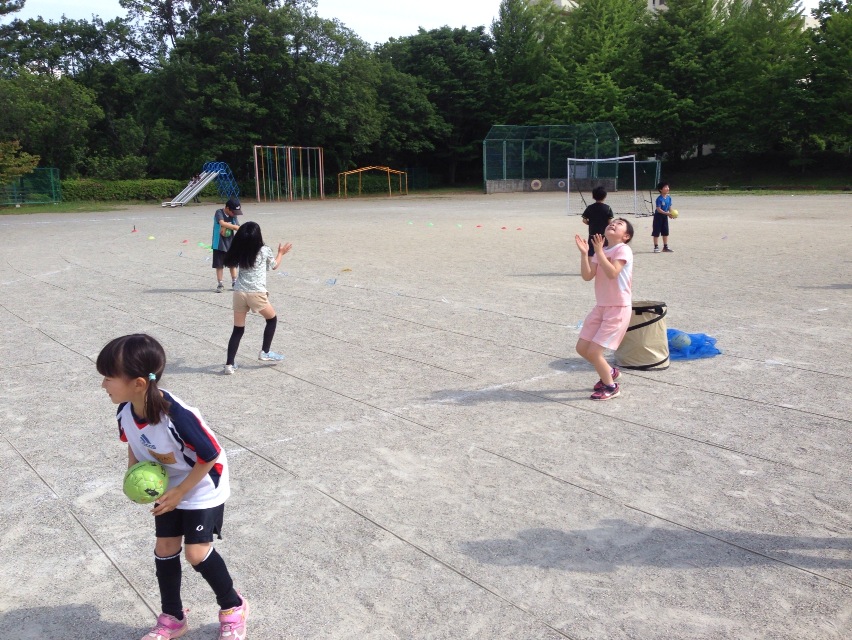 ハンドボールのフェイントを覚える必要はないのですが,自由にからだが動かせるようになる練習をいれています。